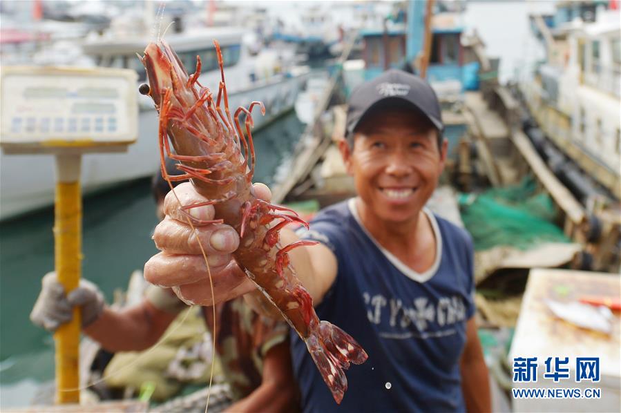 9月18日,在山东青岛小港,一名渔民在码头上展示当天捕获的大竹节虾。 新华社发(王海滨 摄)