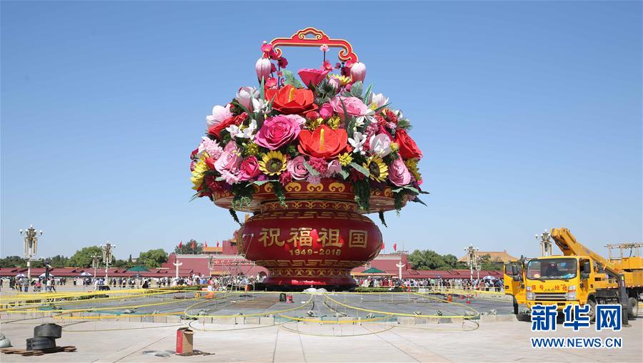 9月21日,工人在天安门广场布置“祝福祖国”巨型花篮。 新华社发(梁志强 摄)