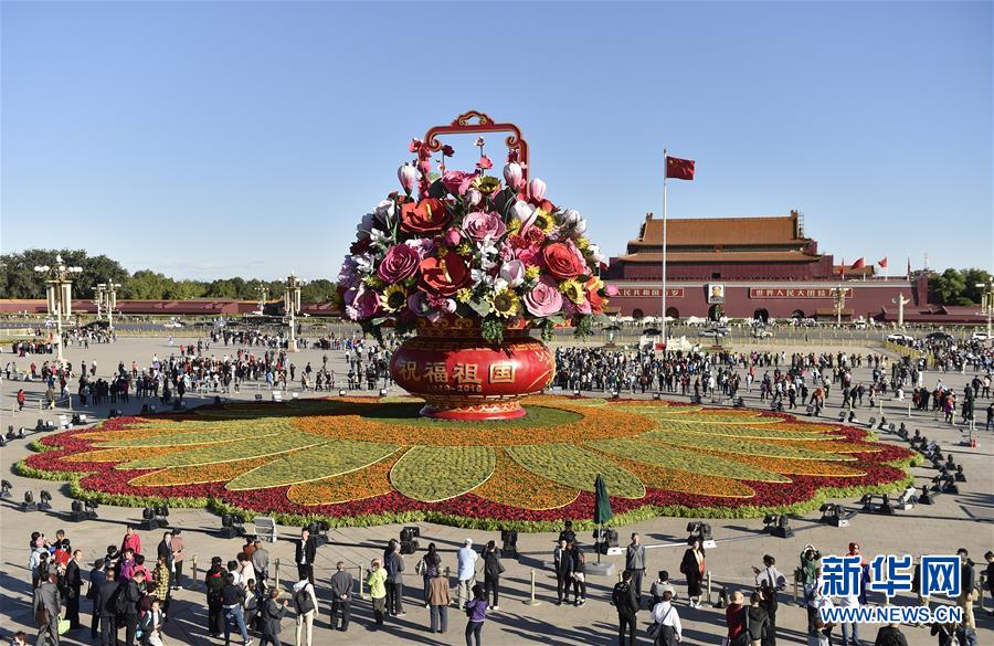 当日,“祝福祖国”巨型花篮在北京天安门广场全面亮相。据了解,从2011年开始,“祝福祖国”巨型花篮一直作为天安门广场中心花坛的主景在国庆节期间向祖国献礼。今年花篮内布置有红掌、梅花、康乃馨、向日葵、兰花、月季等多种仿真花卉,寓意幸福吉祥。 新华社记者 李贺 摄