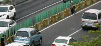 为老人挡住巨大车流。