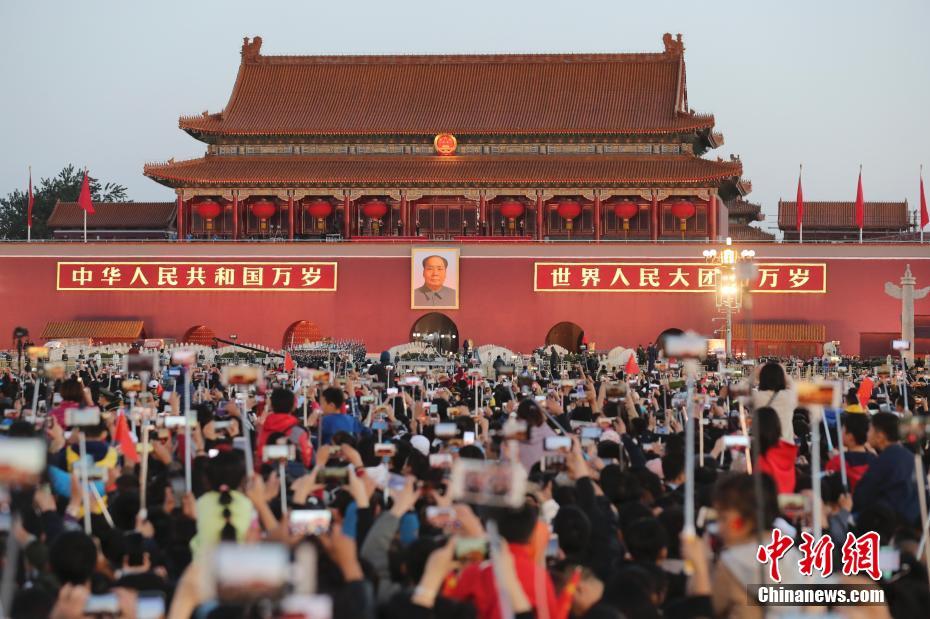 10月1日是中华人民共和国成立69周年纪念日。清晨,来自中国各地的近11万民众特意来到天安门广场观看升旗仪式并唱响国歌,为祖国母亲庆祝生日。中新社记者 盛佳鹏 摄
