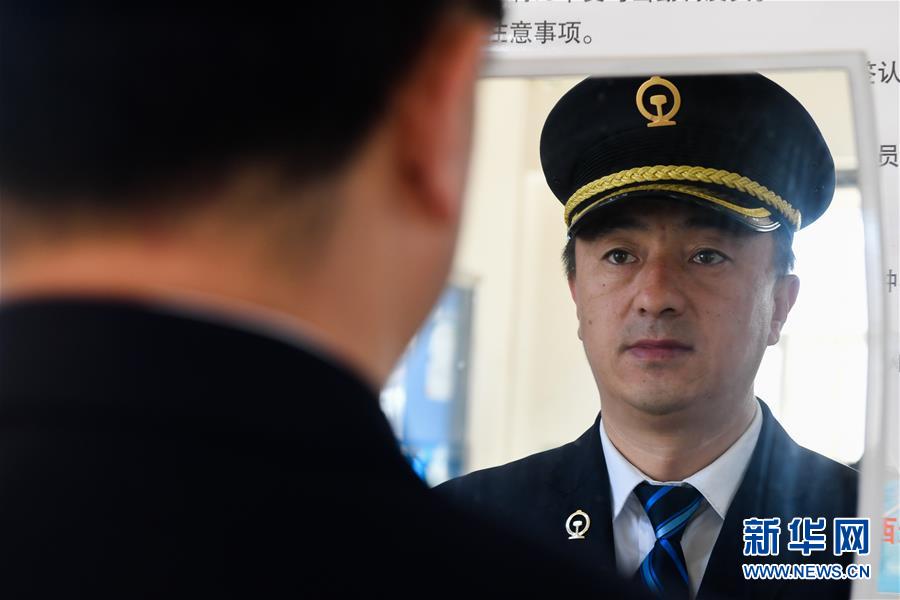 10月1日,弓国庆在呼和浩特东站的办公室里整理着装。