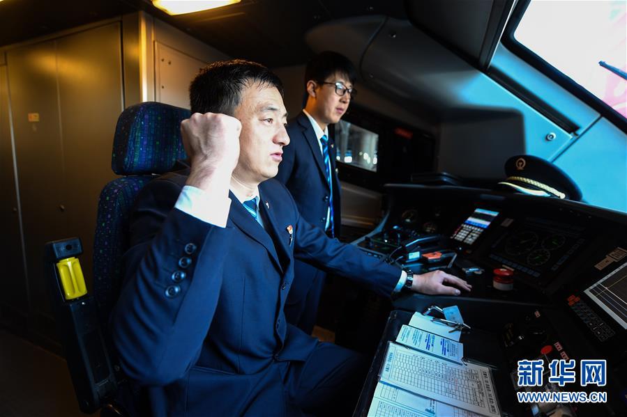10月1日,呼和浩特至乌兰察布的动车启动,弓国庆(前)专心开车,旁边的年轻司机李子龙在学习。