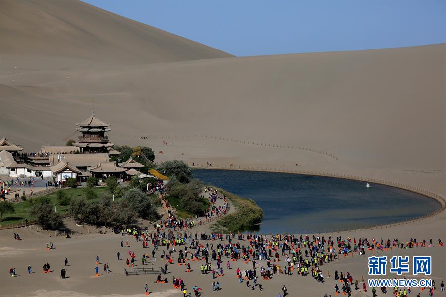 游客在甘肃省敦煌市鸣沙山月牙泉景区参观游览(10月3日摄)。 新华社发(张晓亮 摄)