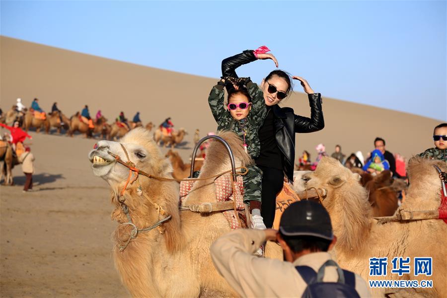 游客在甘肃省敦煌市鸣沙山月牙泉景区参观游览(10月3日摄)。 新华社发(张晓亮 摄)