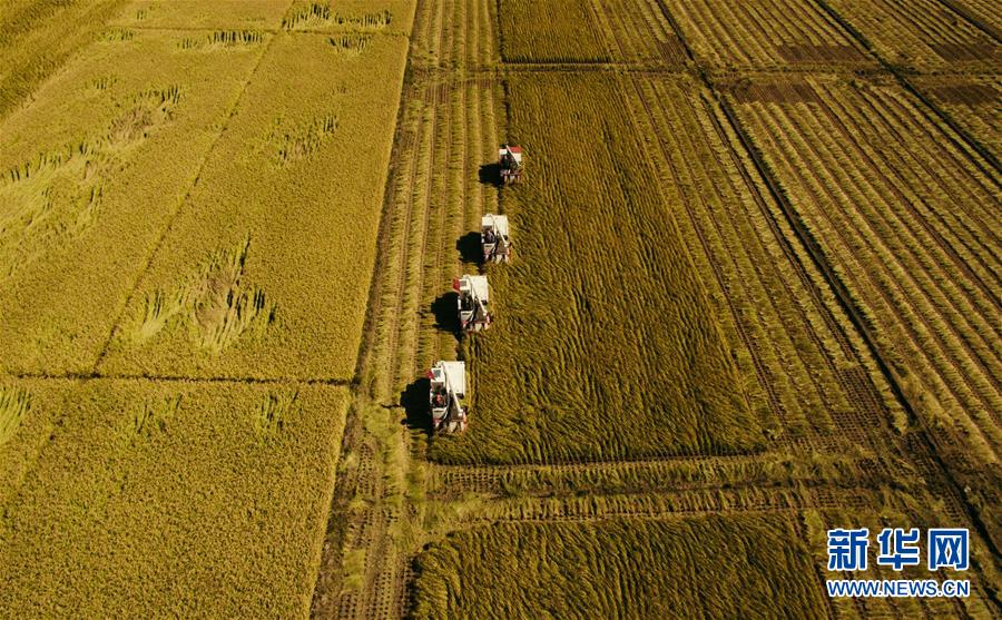 在吉林省吉林市万昌镇,农民驾驶收割机收割水稻(9月18日无人机拍摄)。 金秋十月,位于“黄金水稻带”的吉林省喜迎丰收,全省1200多万亩水稻陆续开镰。 记者在吉林省水稻主产区走访发现,连年丰收的喜人图景背后,蕴藏着许多引人瞩目的“时代之变”。 新华社记者 许畅 摄