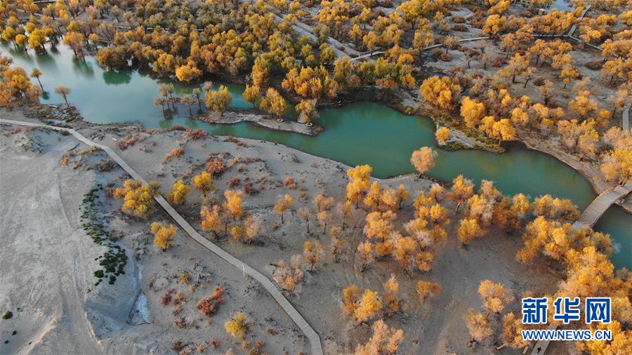 这是在内蒙古自治区额济纳旗拍摄的胡杨林(10月10日无人机拍摄)。 金秋时节,内蒙古自治区额济纳旗胡杨林如同披上金装,成为大漠中的一抹亮色,吸引众多中外游客前来观赏游玩。 新华社记者邹予摄