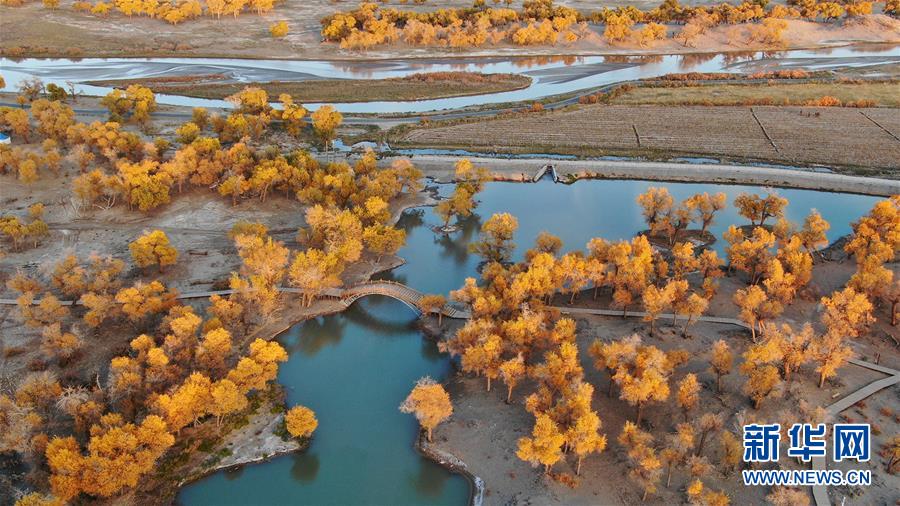 这是在内蒙古自治区额济纳旗拍摄的胡杨林(10月10日无人机拍摄)。 金秋时节,内蒙古自治区额济纳旗胡杨林如同披上金装,成为大漠中的一抹亮色,吸引众多中外游客前来观赏游玩。 新华社记者邹予摄