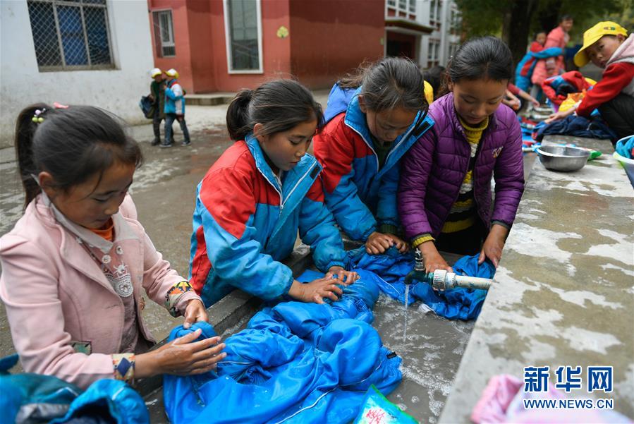 10月13日,西藏昌都市江达县波罗乡第一小学被转移的学生在同普乡中心小学院内洗衣服。 新华社记者 刘东君 摄