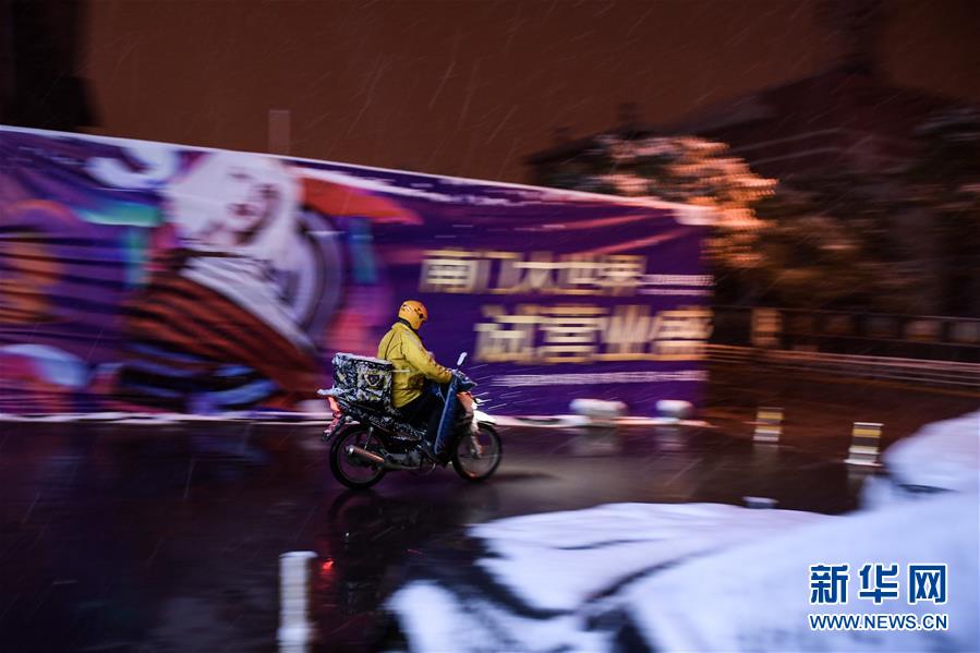 在青海省西宁市,一名外卖配送员冒雪骑行(11月3日摄)。 11月3日,青海省西宁市等地迎来降雪。 新华社记者 吴刚 摄