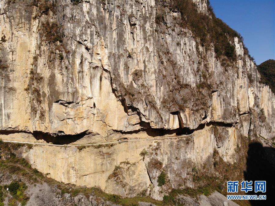 11月8日,车辆行驶在石板河村悬崖上的通村公路上(无人机拍摄)。 新华社发(韩贤普 摄)