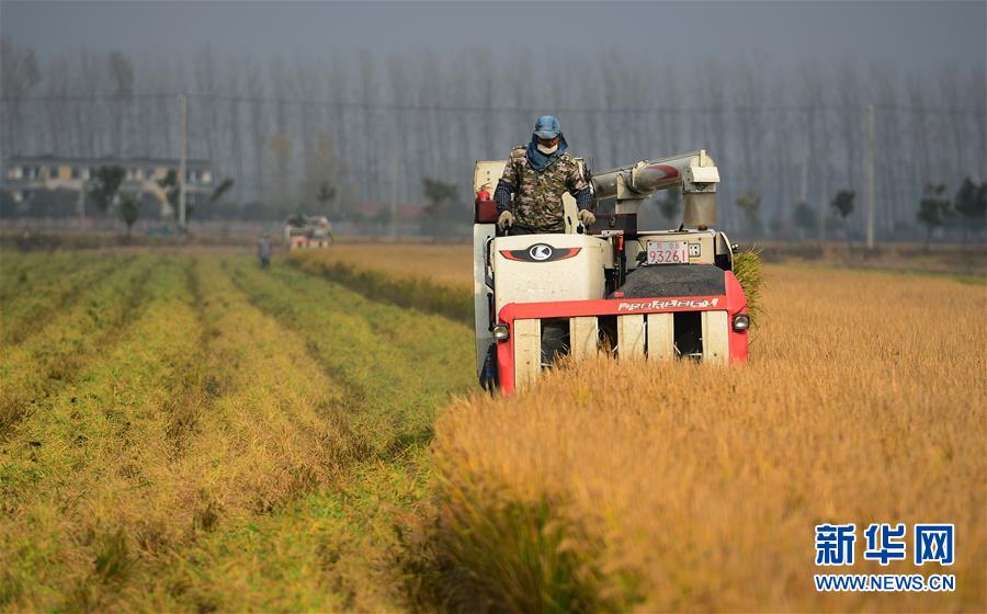 11月10日,江苏省淮安市洪泽区三河镇农民在收割水稻。 新华社发(张建 摄)