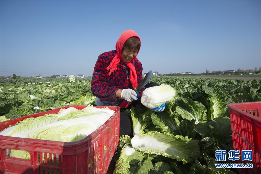 11月10日,江苏省海安市角斜镇汤灶村农民在田间收获大白菜。 新华社发(徐劲柏 摄)