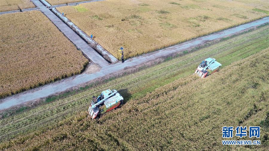 11月10日,江苏省淮安市洪泽区三河镇农民在收割水稻(无人机拍摄)。 新华社发(张建 摄)