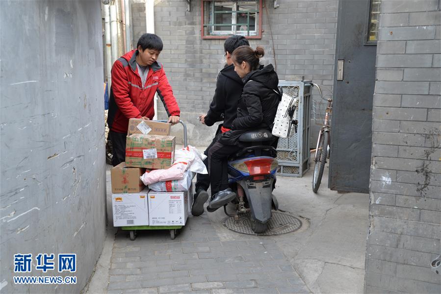 11月10日,李颜招(左)推着手推车在北京金融街街道的一条胡同里送货。 新华社发(徐钦 摄)