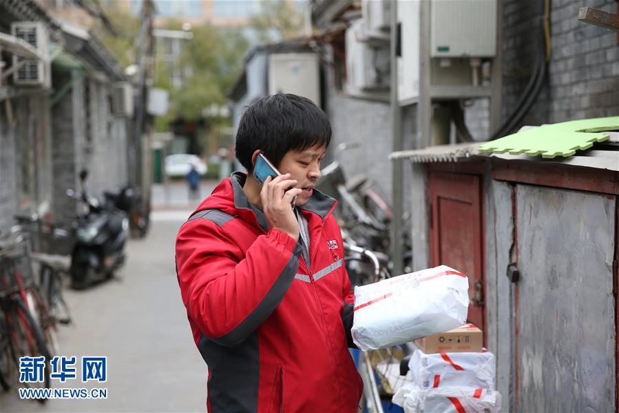 11月10日,在北京市金融街街道,李颜招联系顾客,准备派送。 新华社发(张浩波 摄)