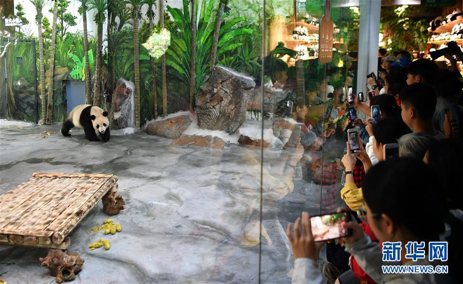 11月25日,游客在海南热带野生动植物园熊猫馆观看大熊猫“舜舜”。新华社记者 郭程 摄