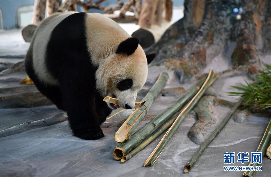 11月25日,大熊猫“舜舜”在海南热带野生动植物园熊猫馆吃竹子。新华社记者 郭程 摄