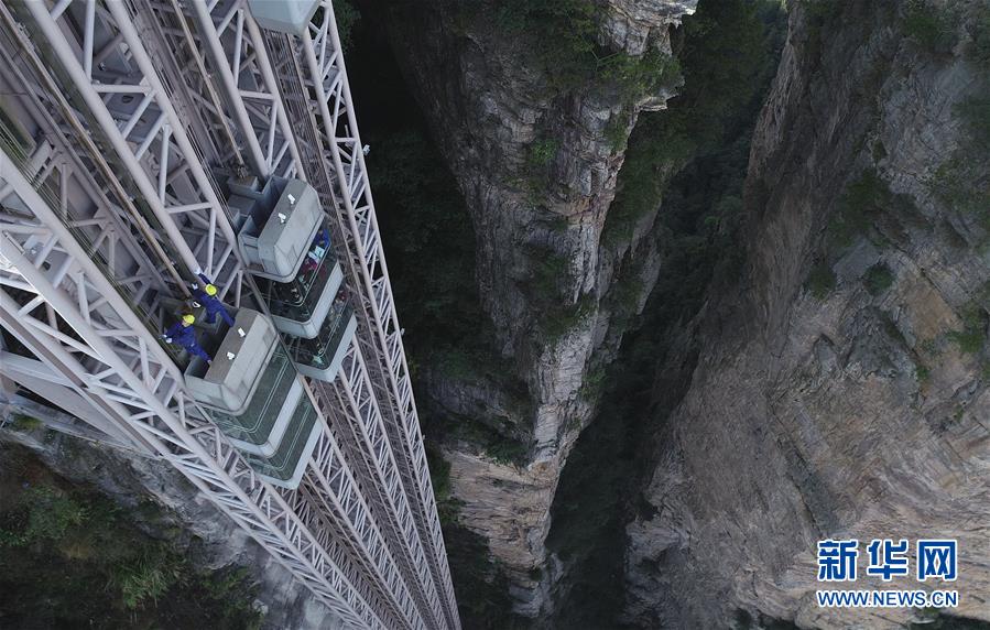 周红云(左)与同事在电梯钢井架检查缆绳运行情况(11月26日无人机拍摄)。 新华社发(吴勇兵 摄)