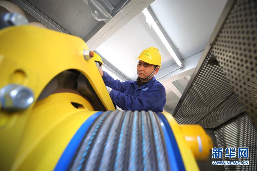 11月26日,周红云(右)检查电梯轮组运行情况。 新华社发(吴勇兵 摄)