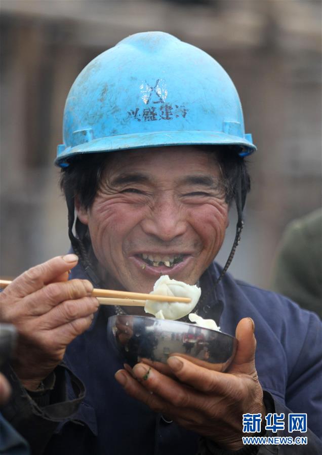 新华社照片,扬州(江苏),2018年12月21日 冬至到 饺子香 12月21日,在江苏省扬州市一处建筑工地,建筑工人在吃饺子。 当日,在冬至即将到来之际,江苏省扬州市邗源社区与黄金社区联合开展“暖心饺子迎冬至”活动,社区的志愿者们为建筑工地的工人准备了热腾腾的饺子,送去冬天的温暖。 新华社发(孟德龙 摄)