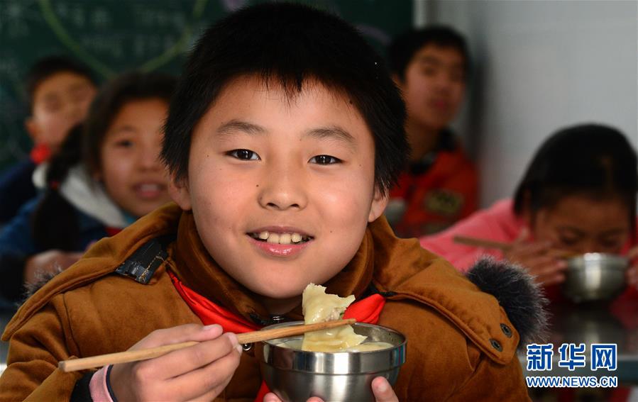 12月21日,青山乡黄大桥教学点六年级学生徐钧在吃饺子。 12月21日,在地处大别山区的安徽省六安市裕安区青山乡黄大桥教学点,老师带着整个教学点的9名学生一起包饺子、吃饺子,迎接冬至。 新华社发(陈力 摄)