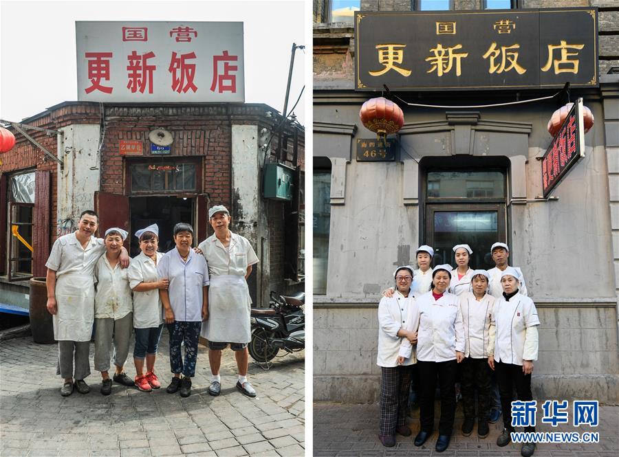 左图:2016年7月13日,部分工作人员在道外区北五道街“更新饭店”原址门前合影留念。右图:2018年12月18日,部分工作人员在道外区南四道街“更新饭店”现址门前合影留念(拼版照片)。 新华社记者 王松 摄