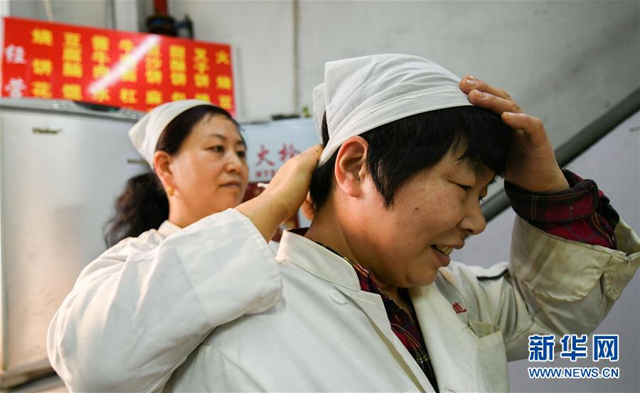12月18日,“更新饭店”两名服务员互相帮助佩戴头巾。 新华社记者 王松 摄