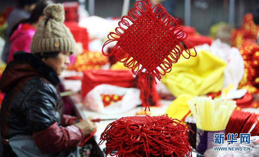 12月25日,山东省临沂市郯城县红花镇一家节庆用品生产企业工人在加工“中国结”。