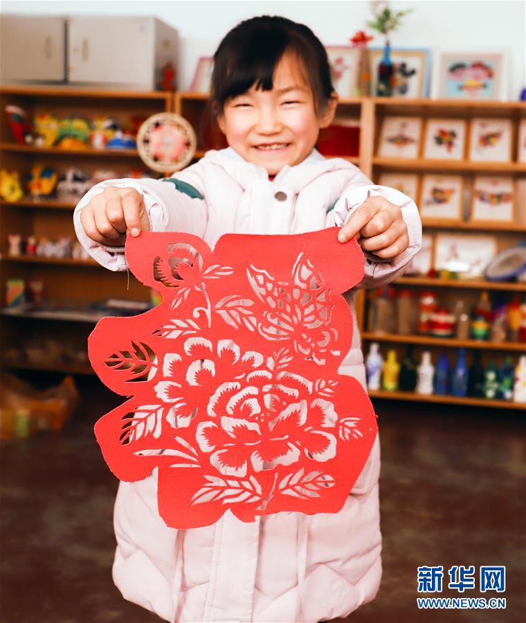12月29日,河北唐山遵化市特殊教育中心的学生在展示剪纸作品。 新年临近,人们以各种各样的方式迎接新年,表达对新年的祝福。 新华社发(刘满仓 摄)