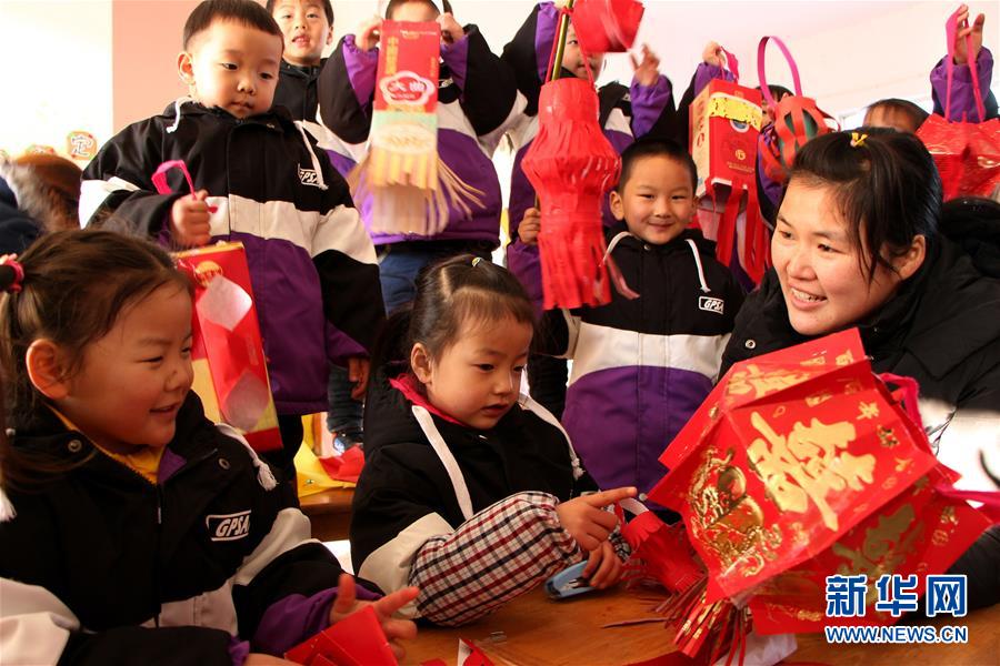 12月29日,在江苏省宝应县夏集镇子婴河幼儿园,小朋友在迎新年主题活动中制作灯笼。 新年临近,人们以各种各样的方式迎接新年,表达对新年的祝福。 新华社发(沈冬兵 摄)