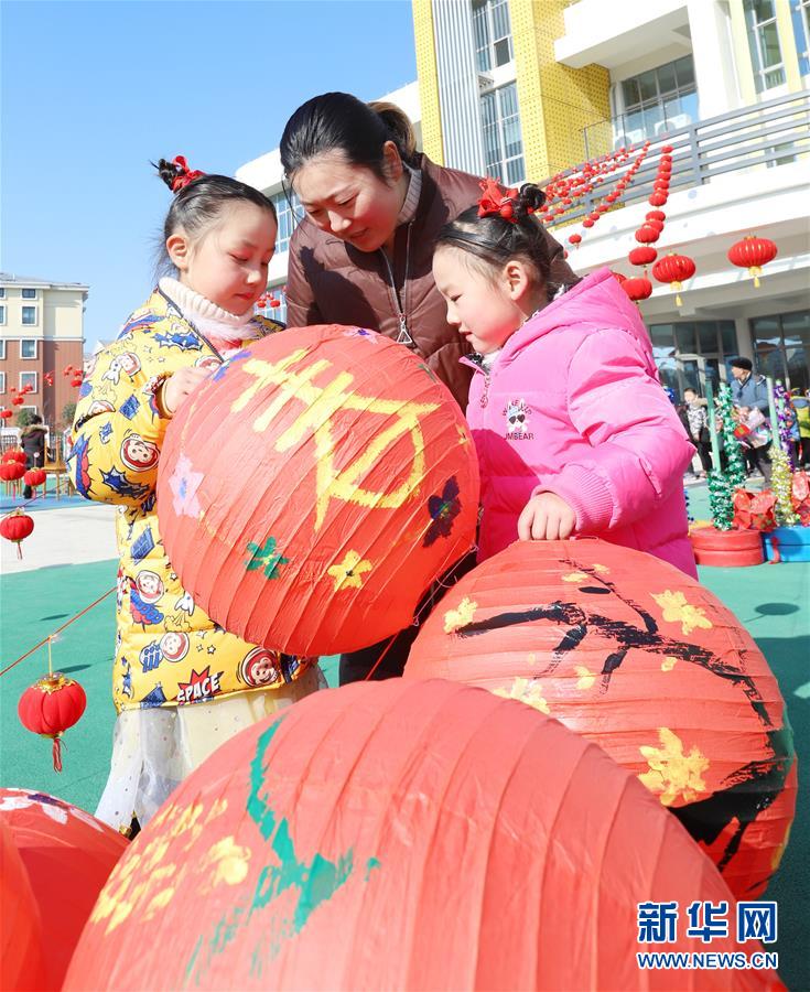 12月29日,在江苏省海安市城东镇西场幼儿园,老师和小朋友准备悬挂彩绘灯笼。 新年临近,人们以各种各样的方式迎接新年,表达对新年的祝福。 新华社发(向中林 摄)