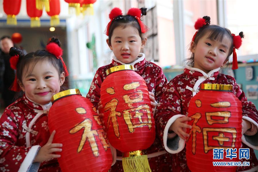 12月29日,安徽省淮北市凤凰幼儿园的孩子们在民俗迎新年活动中手拿红灯笼拍照。 新年临近,人们以各种各样的方式迎接新年,表达对新年的祝福。 新华社发(李鑫 摄)