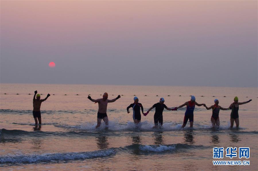 2019年1月1日,在山东省日照市万平口景区,冬泳爱好者在海水中迎接新年的到来。