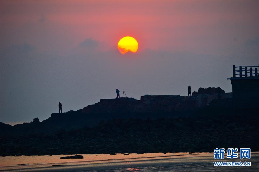 2019年1月1日,摄影爱好者在山东青岛第三海水浴场拍摄日出。