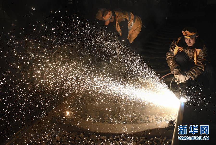 1月15日凌晨,中铁十一局施工人员在西安站改现场切割钢轨。新华社记者陶明摄