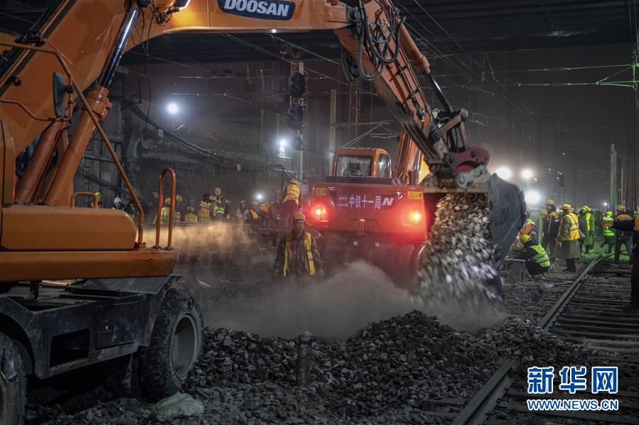 1月15日凌晨,中铁十一局施工人员在西安站改现场紧张施工。新华社记者陶明摄