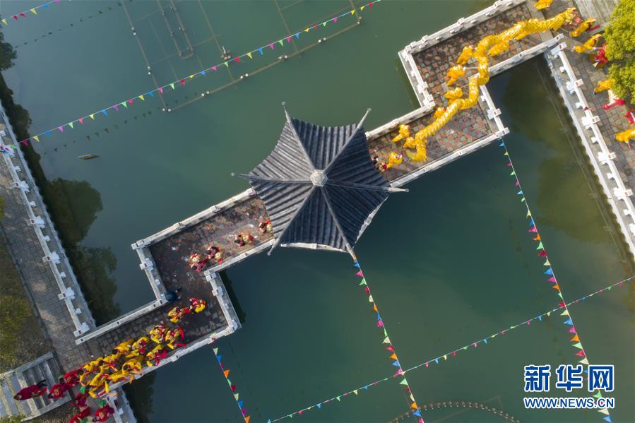 2月5日,在江苏省海安市曲塘镇刘圩村,民俗文艺表演队进行表演(无人机拍摄)。 新华社发