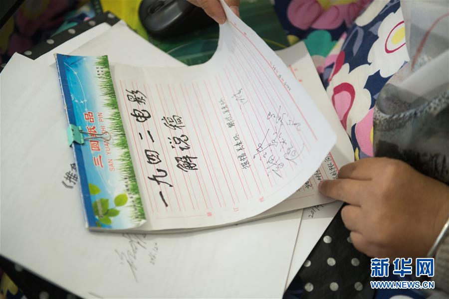 4月11日,吴素环在位于桐庐县桐君街道的家中翻阅自己曾经写过的电影解说稿。新华社记者翁忻旸摄