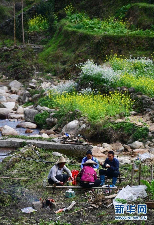 在广西融水苗族自治县杆洞乡乌英苗寨,村民们在田间吃午饭(2018年3月15日)。 新华社记者 黄孝邦 摄