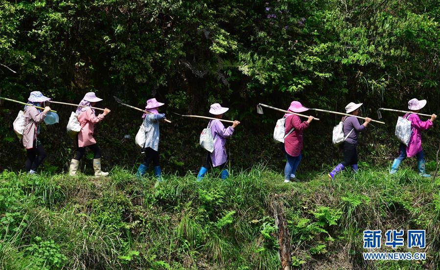 在广西融水苗族自治县杆洞乡尧告村大寨屯,参加水渠维修工作的群众吃完午饭后走在回家的山路上(4月23日摄)。 新华社记者 黄孝邦 摄