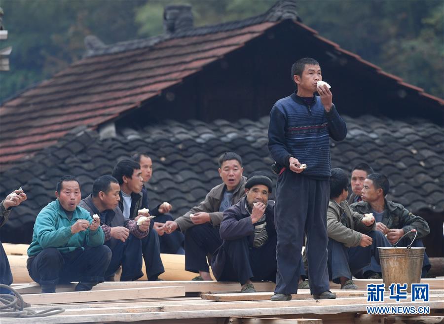 在广西融水苗族自治县杆洞乡乌英苗寨,参加危旧房改造工作的村民们在户外吃糯米饭和酸鱼(2017年11月16日摄)。 新华社记者 黄孝邦 摄