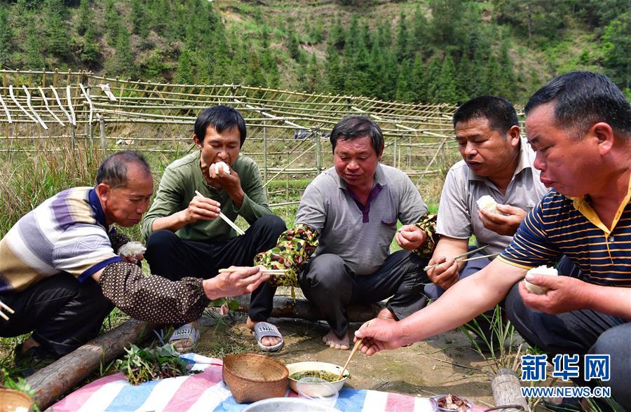 在广西融水苗族自治县杆洞乡杆洞村高显屯木耳种植基地,村民们在吃午饭(4月20日摄)。 新华社记者 黄孝邦 摄