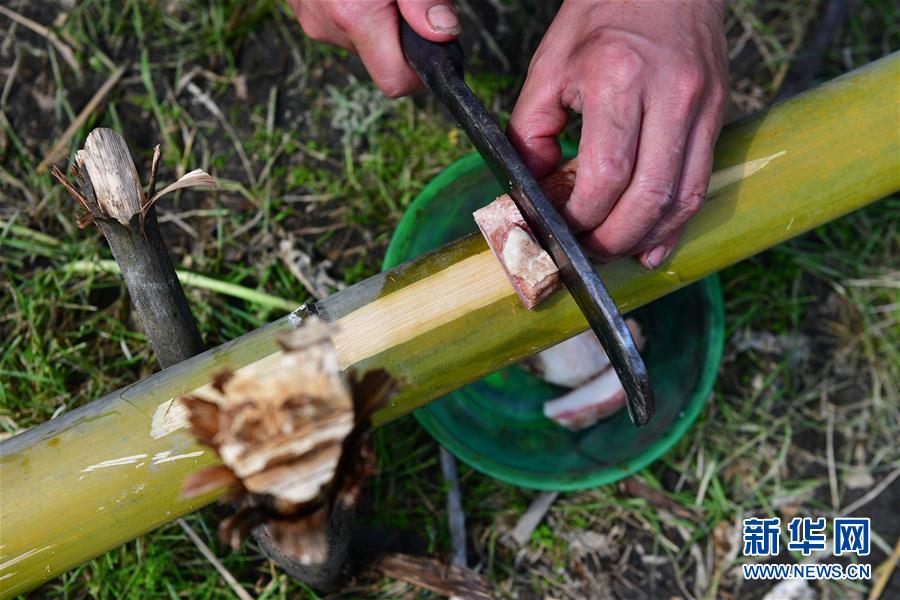 在广西融水苗族自治县杆洞乡乌英苗寨,贫困户梁秀金在竹筒上切肉,准备在田间煮午饭(2018年3月15日)。 新华社记者 黄孝邦 摄