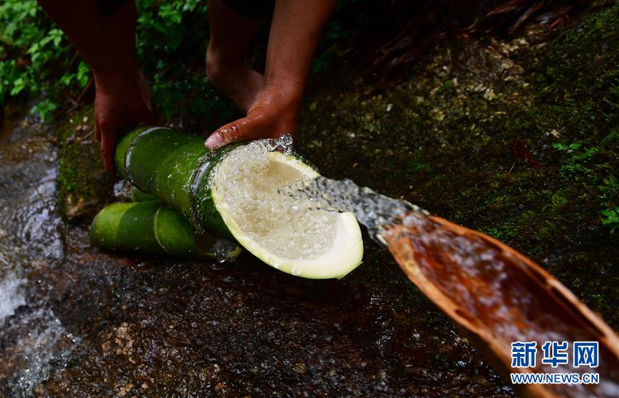 在广西融水苗族自治县杆洞乡尧告村周理屯,在山上种植铁皮石斛的村民在接山泉水,准备煮饭(4月22日摄)。 新华社记者 黄孝邦 摄