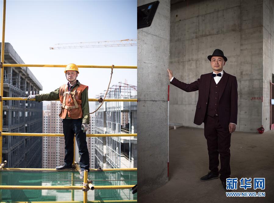 拼版照片:左图为4月27日,青海省西宁市中建三局开发投资大厦项目架子工唐会军在工地上;右图为4月27日拍摄的唐会军的写真照片。在“五一”国际劳动节来临之际,中建三局为青海省西宁市几处工地的工人选购礼服。新华社记者拍摄了他们的工作照和写真照,展示劳动者之美。 新华社记者 吴刚 摄