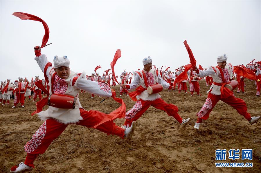 腰鼓手在陕西省延安市安塞区南沟进行一场山地腰鼓演出(2018年10月20日摄)。 新华社记者 刘潇 摄