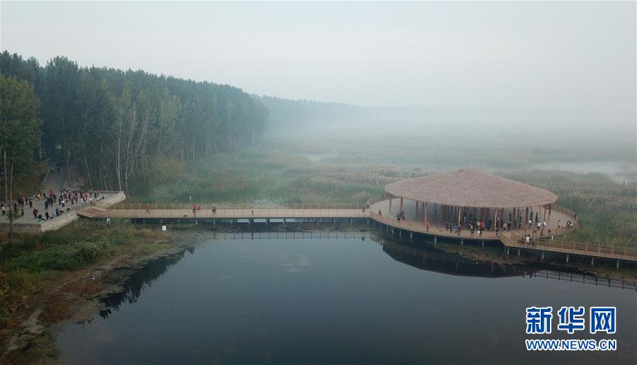 人们在白洋淀边的平台和问源亭里晨练(2017年10月1日无人机拍摄)。 新华社记者陈晔华摄