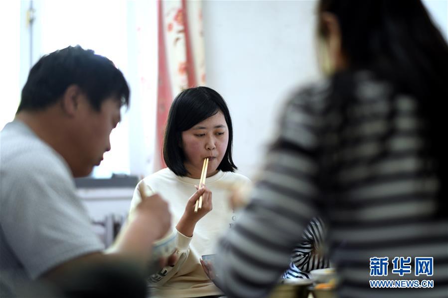 5月9日,秦婷婷(中)在住处与父母一起吃午饭。 新华社记者 王松 摄