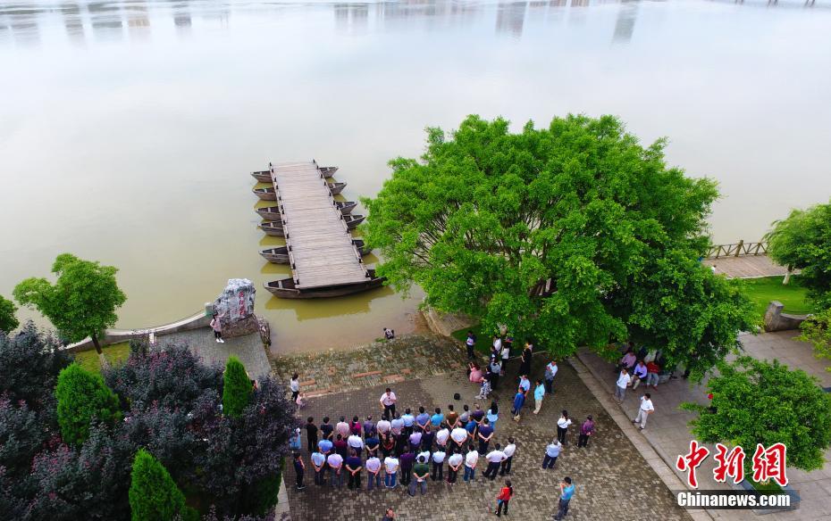 5月24日,在位于江西省赣州市于都县的中央红军长征出发地纪念园,前来参观的民众络绎不绝。图为无人机航拍的中央红军长征出发地旧址于都县城东门渡口。于都是中央红军长征集结出发地。1934年10月,中央机关、中央军委和中央红军主力在此集结出发,踏上漫漫征途。中新社记者 刘占昆 摄